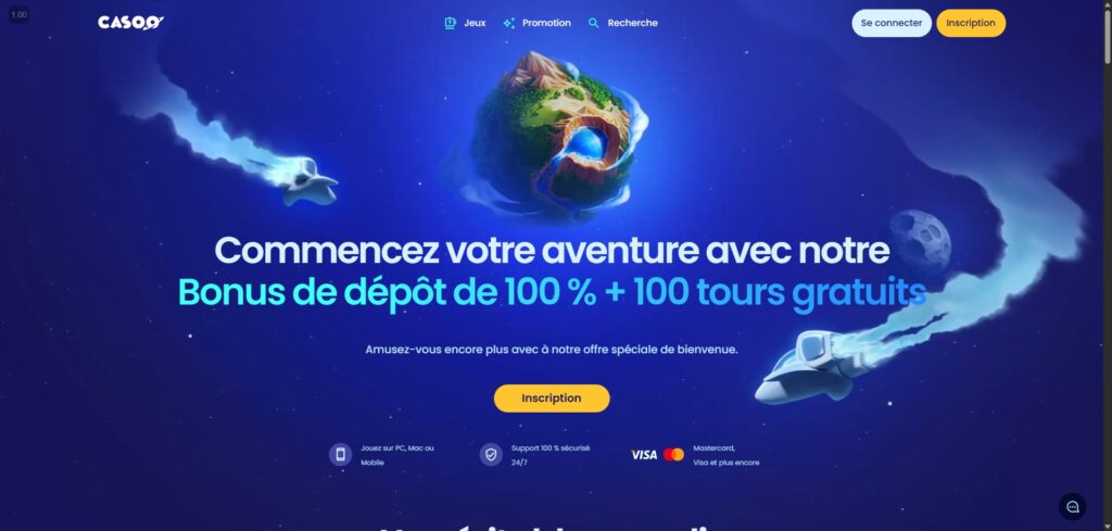 - Casoo : 100% jusqu’à 300€ + 100 Tours gratuits